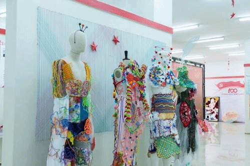 逸美楼展厅作品更是别具匠心,由服与服饰设计专业、民族服装与服饰专业、人物形象设计专业、艺术设计专业、皮具艺术设计专业五个专业的毕业生创作的几百件精美作品,全方位展现了2021届毕业生们的丰富想象力。同时,展厅的布置也处处流露出建党100周年的喜庆气息。