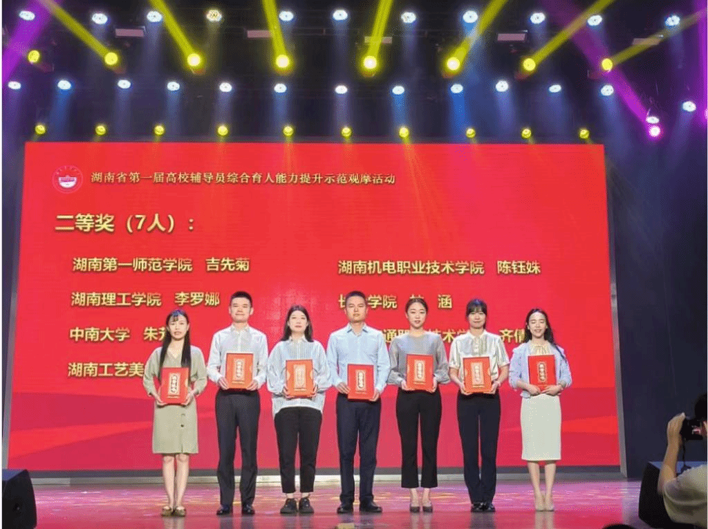 5月22日至25日,由省委教育工委、省教育厅主办的湖南省第一届高校辅导员综合育人能力提升示范观摩活动在湖南农业大学举行,来自全省本、专科学校103名辅导员同台竞技,我院辅导员谭思晴在比赛活动中脱颖而出,荣获大赛二等奖。