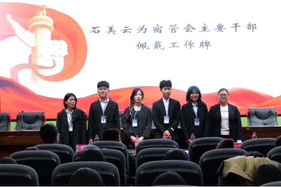 宿管会指导老师石美云为宿管会干部佩戴工作牌