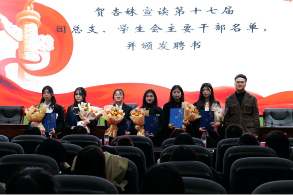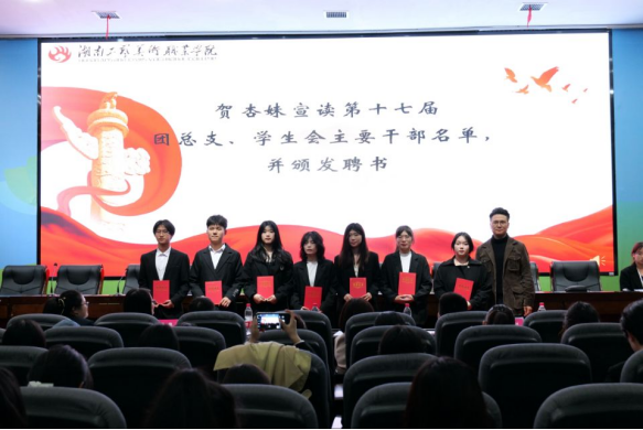 六、贺杏妹宣读第十七届团总支、学生会主要干部名单,并颁发聘书
