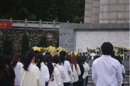 烈士陵园庄严肃穆,苍松翠柏掩映着烈士纪念碑。师生们整齐列队,神情庄重,静静地肃立在革命烈士纪念碑前,为革命先烈默哀,向长眠于地下的革命先烈深深鞠躬。