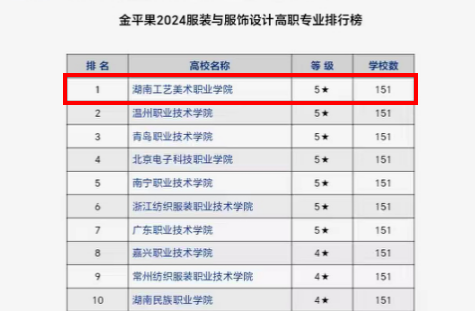 近日,“金平果”发布2024高职专业排行榜,对全国1543所高职院校19个专业大类、97个专业类、738个专业的综合实力进行了深层次、多维度的专业评价。在分专业竞争力排行榜中,我校服装与服饰设计专业全国排名第一。