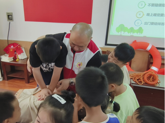 除了宣传教育,志愿者们还积极开展实地救援演练,教授孩子们基本的自救技能和救生技能,如使用救生设备、呼救等和救生的基本常识,确保在发生意外时能够及时进行救援。