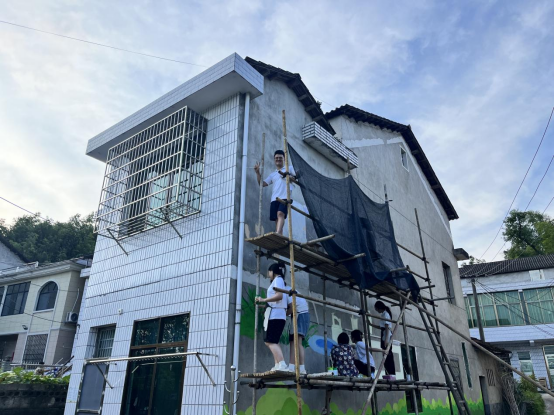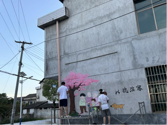 结束了小学的墙绘工作,“筑梦青春”志愿服务团队马不停蹄地奔赴桃江县高桥镇横马塘乡村。高桥镇领导和横马塘村领导热情接待,同学们与村干部一起设计墙绘图案。不比小学校园里,横马塘村的墙绘地点都是户外墙壁,烈日炎炎,即使是早上温度也很快达到35度以上,但是同学们并没有被烈日吓退,与老师一起克服困难,绘出了一幅幅反映乡村生活、展现乡村美景、倡导文明新风的墙绘作品。每一幅墙绘都仿佛在讲述着乡村的故事,传递着乡村的魅力,更传递出积极向上的精神力量。