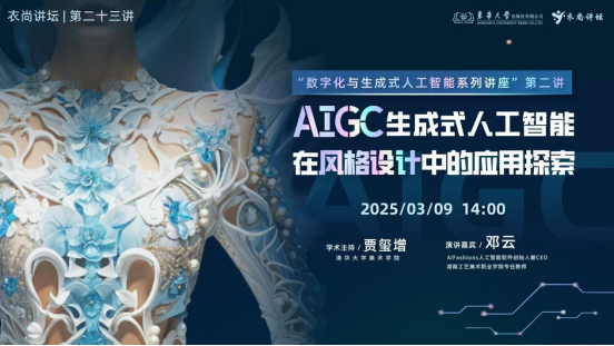 近日,我院服装设计专业教师邓云应邀参加由东华大学出版社、“华夏衣裳”中国高等院校服装论坛联合主办的《数字化与生成式人工智能系列讲座》,以《AIGC生成式人工智能在风格设计中的应用探索》为题进行分享。本次讲座由清华大学美术学院博士生导师贾玺增教授主持,聚焦人工智能技术对设计领域的变革与创新,旨在深入探讨人工智能在服装设计教育与产业应用中的前沿发展趋势。此次讲座通过东华大学出版社与“华夏衣裳”多个平台同步直播,吸引了全国众多高校的服装设计教师、学生以及服装产业界人士在线参与互动,取得了热烈反响。