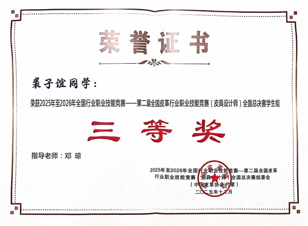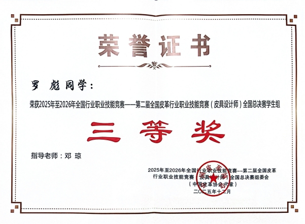 2025年12月23日,第二届全国皮革行业职业技能竞赛(皮具设计师)总决赛赛场传来喜讯。经过激烈角逐,我院皮具(箱包)艺术设计专业学子罗彪、裘子谊凭借扎实的专业功底与出色的现场发挥,从全国众多参赛者中脱颖而出,双双荣获总决赛三等奖。本次大赛获奖,充分彰显了我院在皮具设计领域高技能人才培养方面的显著成效。