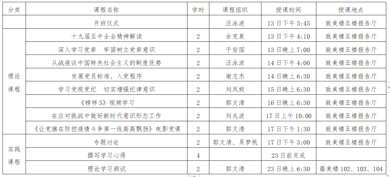 党校2021年第一批党员发展对象培训教学安排