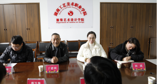 2月24日上午,株洲市工艺美术协会理事长丁建国、秘书田琪一行来我院就株洲工美系列服饰行业技术职称评审工作进行前期调研,株洲市人社局专技科科长陈刚、醴陵市人社局党组成员、副局长刘微、专技股股长唐坤等相关人员参加调研座谈会。学院院长、益阳市工艺美术协会理事长高建民主持会议。