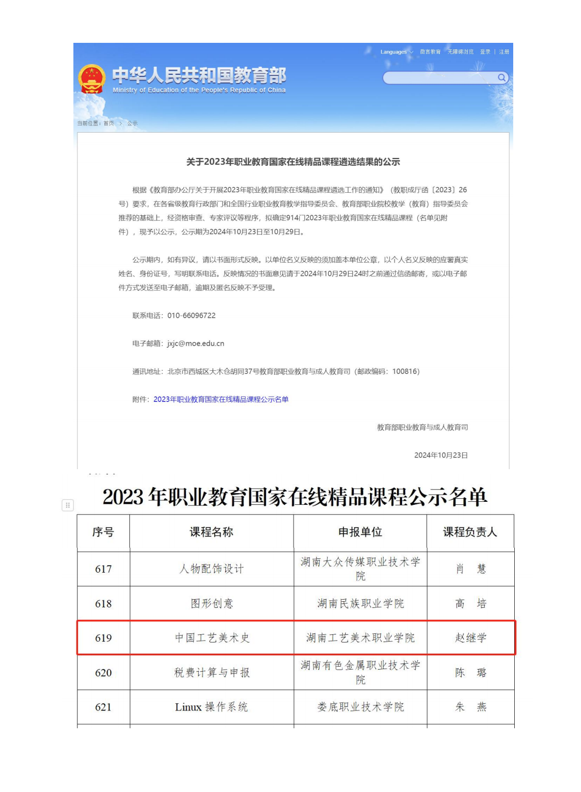 近日,教育部公示2023年职业教育国家在线精品课程遴选结果,学校教师赵继学主持的《中国工艺美术史》课程成功入选,这是学校继2022年立项2门职业教育国家在线精品课程之后取得的又一标志性成果。