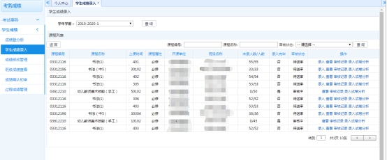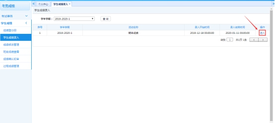1、依次点击【考务成绩】-【学生成绩】-【学生成绩录入】,进入学生成绩录入界面。再选择对应的成绩活动,点击【进入】,就可以看到该活动下需要录入成绩的课程列表。
