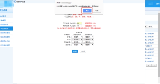 温馨提示:各项成绩所占比例相加为100;其中的排序设置可以不用进行设置,系统会自动按照学生学号由小到大进行排序。点击‘设置’按钮没有弹窗出现,是浏览器设置了禁止弹窗的原因,建议百度下对应浏览器如何取消‘禁止弹窗’。