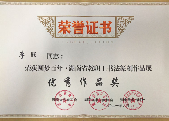 本次李照老师携作品《古诗源诗三首》,献礼中国共产党成立一百周年,经过大赛组委会从收到的1024幅参赛作品中,层层筛选,共评选出优秀作品32幅,入展作品126幅,学校书法协会会长李照老师的作品荣获大赛“优秀作品奖”。此次书法篆刻作品展,提升了我校在省内书法界的知名度和影响力,弘扬了中华优秀传统文化,让社会各界书法爱好者感受了书法艺术之美,在挥洒笔墨之间感悟到了古诗文的魅力。