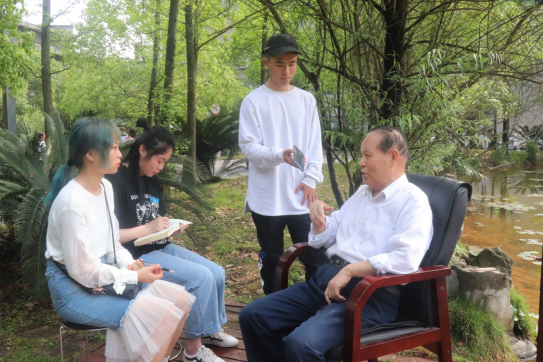 根据湖南省教育厅关心下一代工作委员会下发《关于在全省普通高校全面开展“读懂中国”活动的通知》,装饰艺术设计系为创新大学生思想政治教育形式和内容,让我系学生进一步深刻感受中国的历史变革和伟大成就,深切感悟中国共产党的历史担当和社会主义制度的优越性,进一步坚定走中国特色社会主义道路的信心和自觉性。为教育引导广大青年学生坚定“四个自信”,切实增强广大青年学生对中国共产党的领导和中国特色社会主义的的思想认同、情感认同、价值认同。2019年4月25日,在美丽的会龙山龙泉湖畔,装饰艺术设计系学生会宣传部对我校原校长张国卿老同志进行了专访,83岁高龄的张校长精神矍铄、温暖慈祥,与采访的同学们畅谈美院“奋斗史”以及他对发展教育事业的真实感悟。