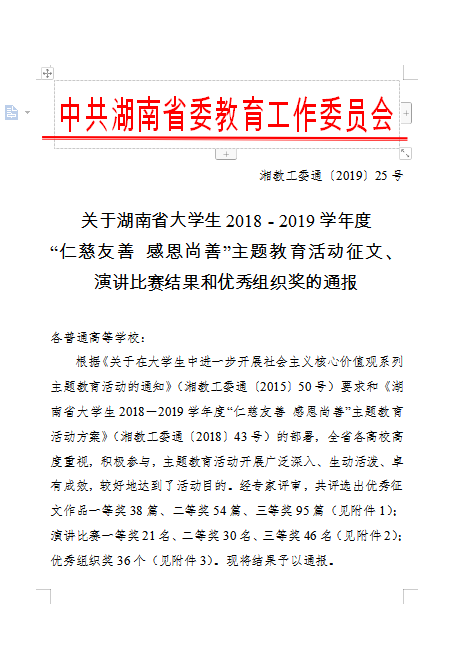 湘教工委通〔2019〕25号 关于湖南省大学生2018-2019学年度“仁慈友善 感恩尚善”主题教育活动征文、演讲比赛结果和优秀组织奖的通报
