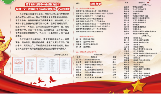 活动得到了教职工家庭的大力支持,教职工子女纷纷积极报名参与。经过初选、复选,最终选送了10篇征文推荐到益阳市直关工委,益阳市精神文明指导委员会等6部门认真评审,选出一等奖一篇、二等奖一篇、三等奖两篇,优秀奖四篇,学校关工委荣获“优秀组织”奖。