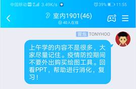 带班教师通过测试各大平台的稳定性及使用便携性,综合初次问卷调查结果,经商讨选取腾讯课堂作为直播媒介并根据授课进度修订授课计划、确定直播时间段。教师提前通过QQ班级群,将线上教学通知及课堂直播邀请码发放给学生,务必确保所有学生接收消息到位。