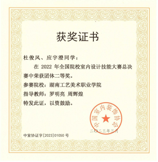2023年3月26日,全国院校室内设计技能大赛(全国总决赛)在北京电子科技职业学院落下帷幕。我院参赛学生2020、2021级室内艺术设计专业杜俊风、应宇澄(指导教师:罗明亮、周辉煌)荣获全国二等奖,学校获评“优秀组织单位”荣誉称号。