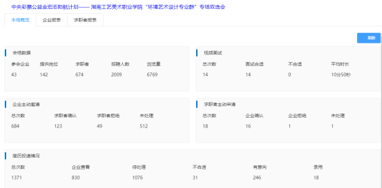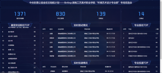 经过前期广泛宣传,积极动员,此次双选会遴选了湖南香瑞东家乐建筑装饰设计工程有限公司、深圳市名雕装饰股份有限公司等43家知名企业参加招聘,提供了142个优质岗位,岗位需求人数2009人。招聘岗位与我院专业匹配度高,其中一半以上岗位薪资待遇、发展空间较大。经统计,此次双选会平台浏览量达6823人次,毕业生与用人单位在线沟通并提交求职简历共1390次。