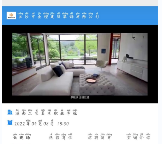 4月8日、4月28日,我院邀请金煌家装集团分别在云就业平台、尚美楼214教室举办线上、线下专场招聘宣讲会。