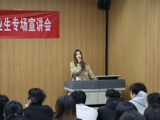 宣讲会上企业负责人肖霄首先展示并介绍了企业,接着叙述了企业招人计划,最后向同学们讲述现今社会就业形式,表达企业对人才需求。