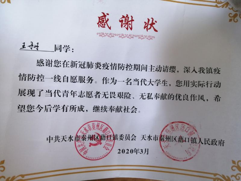 二、面对突如其来的新型冠状病毒肺炎疫情,学生党员王丹丹积极响应地方政府号召,不畏疫情,勇于担当,报名参与此次战“疫”行动中来。