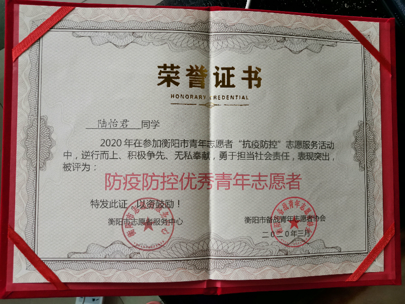 一、“疫情就是命令,防控就是责任。”当听到共青团衡阳市委“疫情防控”备战青年志愿者服务队招募大学生志愿者的消息时,陆怡君毫不犹豫响应号召、冲锋在前。作为衡阳市的民众,她热爱自己的家乡;作为一名学生党员,她时刻不忘“为人民服务”的宗旨。