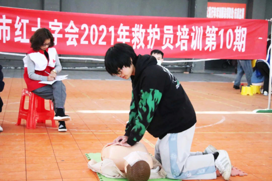 活动后期,同学们分组上场操作急救技能,专家们在旁一一提示要点、纠正错误动作,力求急救知识入脑入心、急救技能准确运用,最终98名学生通过考核获得市红十字会颁发的救护证。