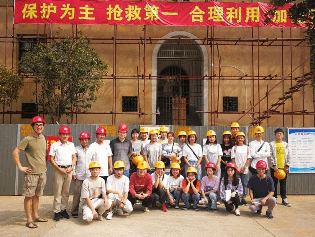 (校企双方指导老师与学生们在国保文物建筑益阳信义教学楼前合影)