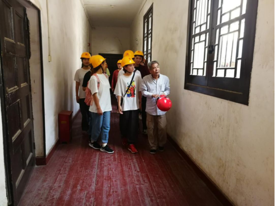 (王殿亭老师带同学们参观国保益阳信义教参学楼,讲解建筑特色与特点)