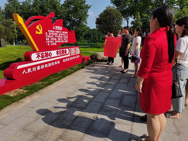 随后,后勤处党支部全体成员,游览了来仪湖抗洪纪念馆、竹泉山智慧农业第一村。了解了来仪湖从烂泥湖到正式定名为来仪湖的历史由来以及艰苦奋斗、团结协作、无私奉献的烂泥湖精神;感受到了乡村振兴战略下的智慧化农业发展水平:竹泉山智慧农业第一村将管理、生产、溯源、营销、服务、水肥一体化管控、乡村安防等功能融入5G智慧农业云平台,构建5G+智慧农业全生命周期管控,实现了“种地不靠人工,收成不靠天气”。真实感受到了益阳人民在中国共产党领导下英勇革命和建设的历史以及美丽乡村建设的丰硕成果。最后,支部全体成员来到在宣誓碑前庄严宣誓,重温入党誓词。