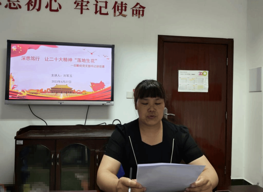 为深入学习贯彻党的二十大精神,让党的创新理论落地生根,6月27日下午,后勤处党支部书记刘军玉以《深思笃行 让党的二十大精神“落地生花”》为题,讲述了一堂精彩生动的党课。