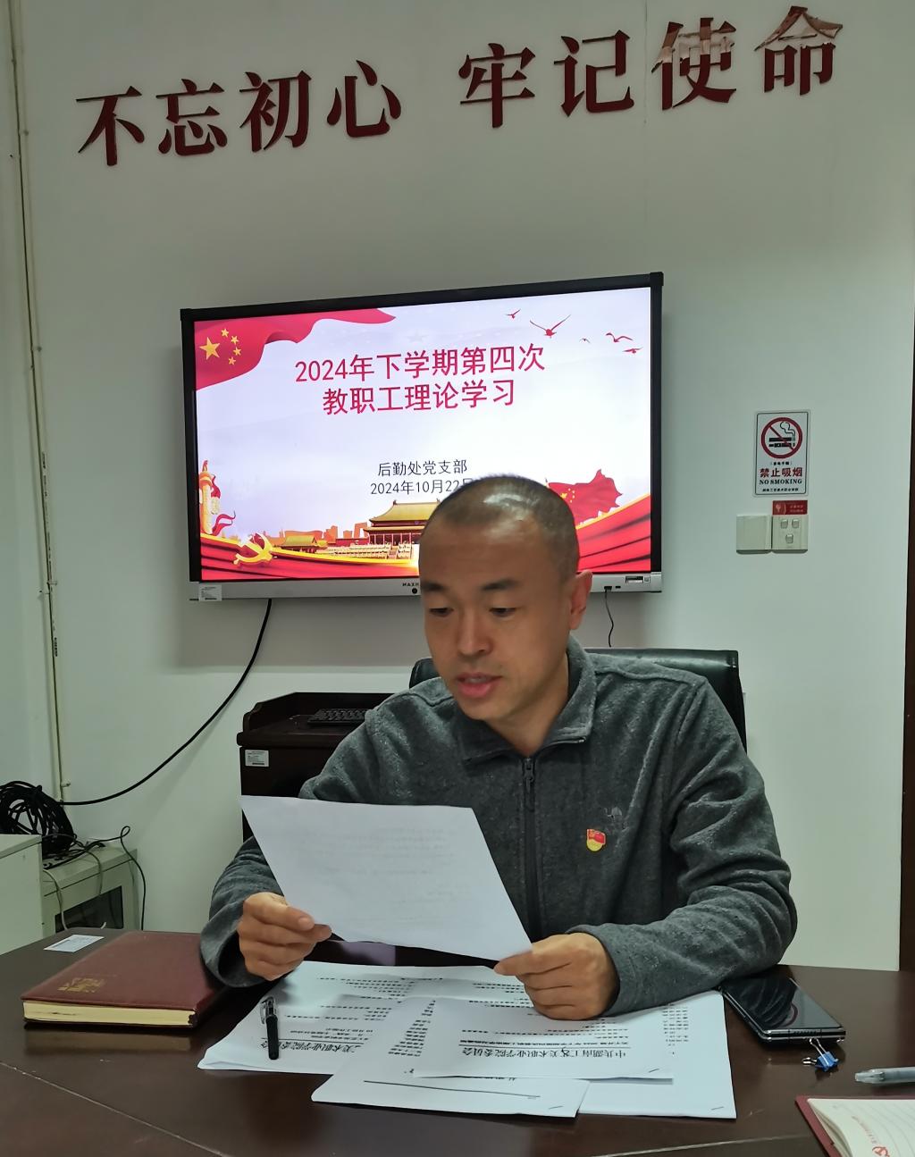 10月22日下午,后勤处党支部在致美楼106党员活动室组织开展2024年下学期第四次教职工理论学习,支部书记刘树飞主持会议,后勤处全体同志参加。