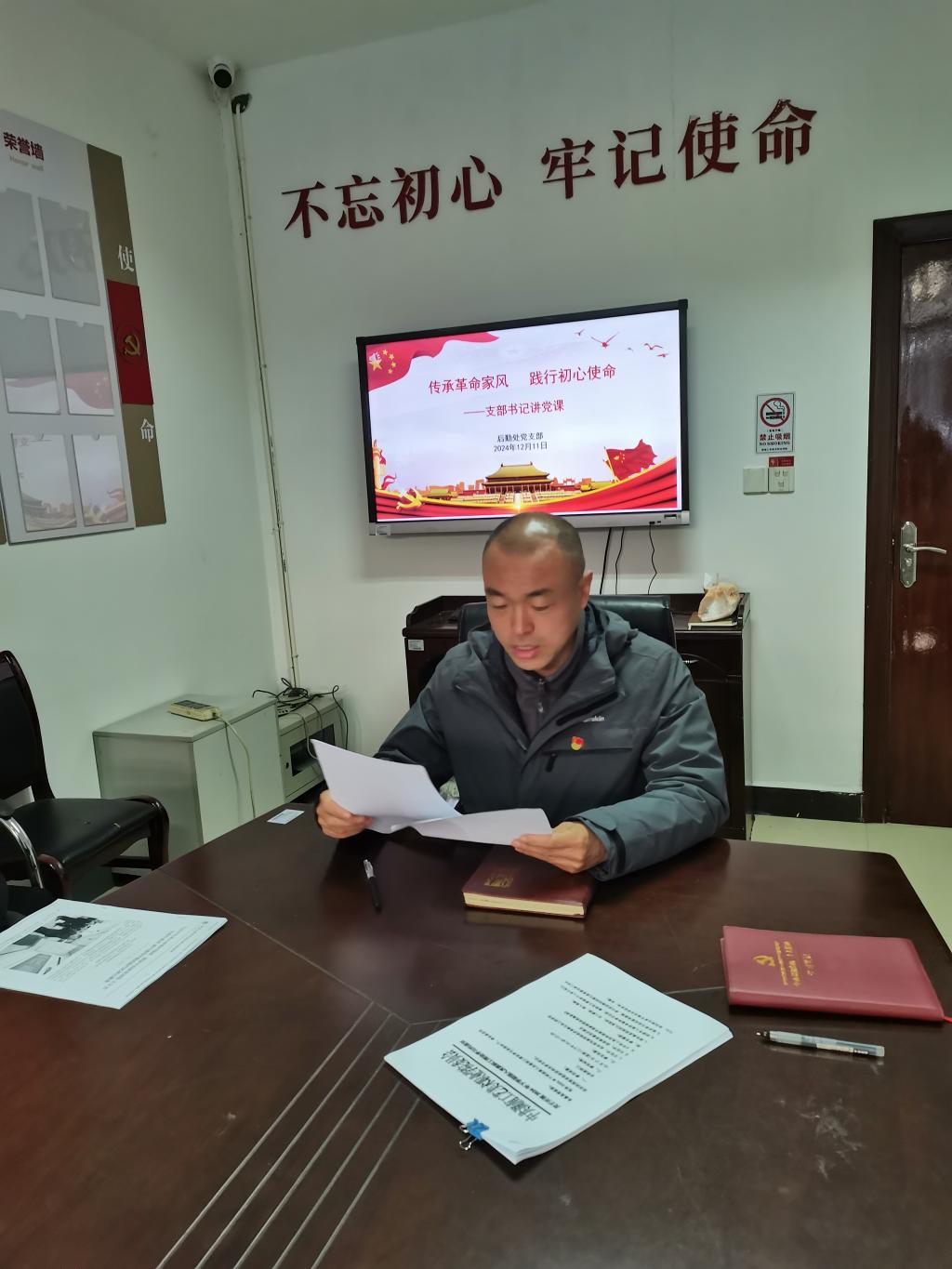 为了深入学习贯彻《中国共产党纪律处分条例》,12月11日下午,后勤处党支部在致美楼106党员活动室组织了一次党员大会。支部书记刘树飞以“传承革命家风,践行初心使命”为主题,为后勤处全体党员同志讲授了一堂深刻的党课。