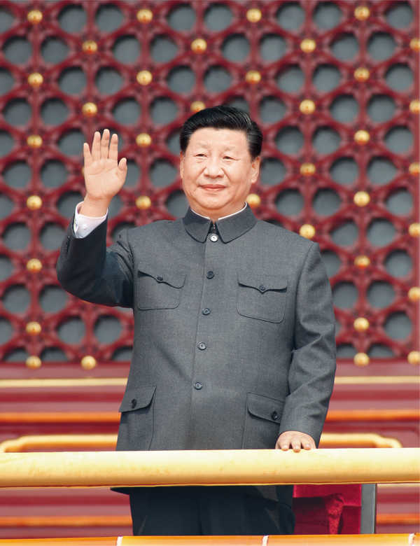 2019年10月1日,庆祝中华人民共和国成立70周年大会在北京天安门广场隆重举行。中共中央总书记、国家主席、中央军委主席习近平发表重要讲话并检阅受阅部队。这是习近平在天安门城楼上。 新华社记者 黄敬文/摄