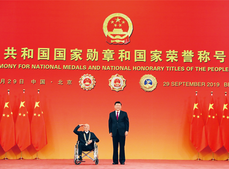2019年9月29日,中华人民共和国国家勋章和国家荣誉称号颁授仪式在北京人民大会堂金色大厅隆重举行。中共中央总书记、国家主席、中央军委主席习近平向“共和国勋章”获得者张富清颁授勋章。 新华社记者 王晔/摄
