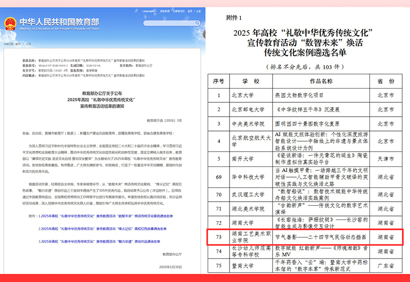 近日,教育部办公厅公布2025年高校“礼敬中华优秀传统文化”宣传教育活动结果,学校视觉传播设计学院师生创作的作品《节气兽影——二十四节气民俗动态插画》,成功入选“数智未来”焕活传统文化案例遴选名单。