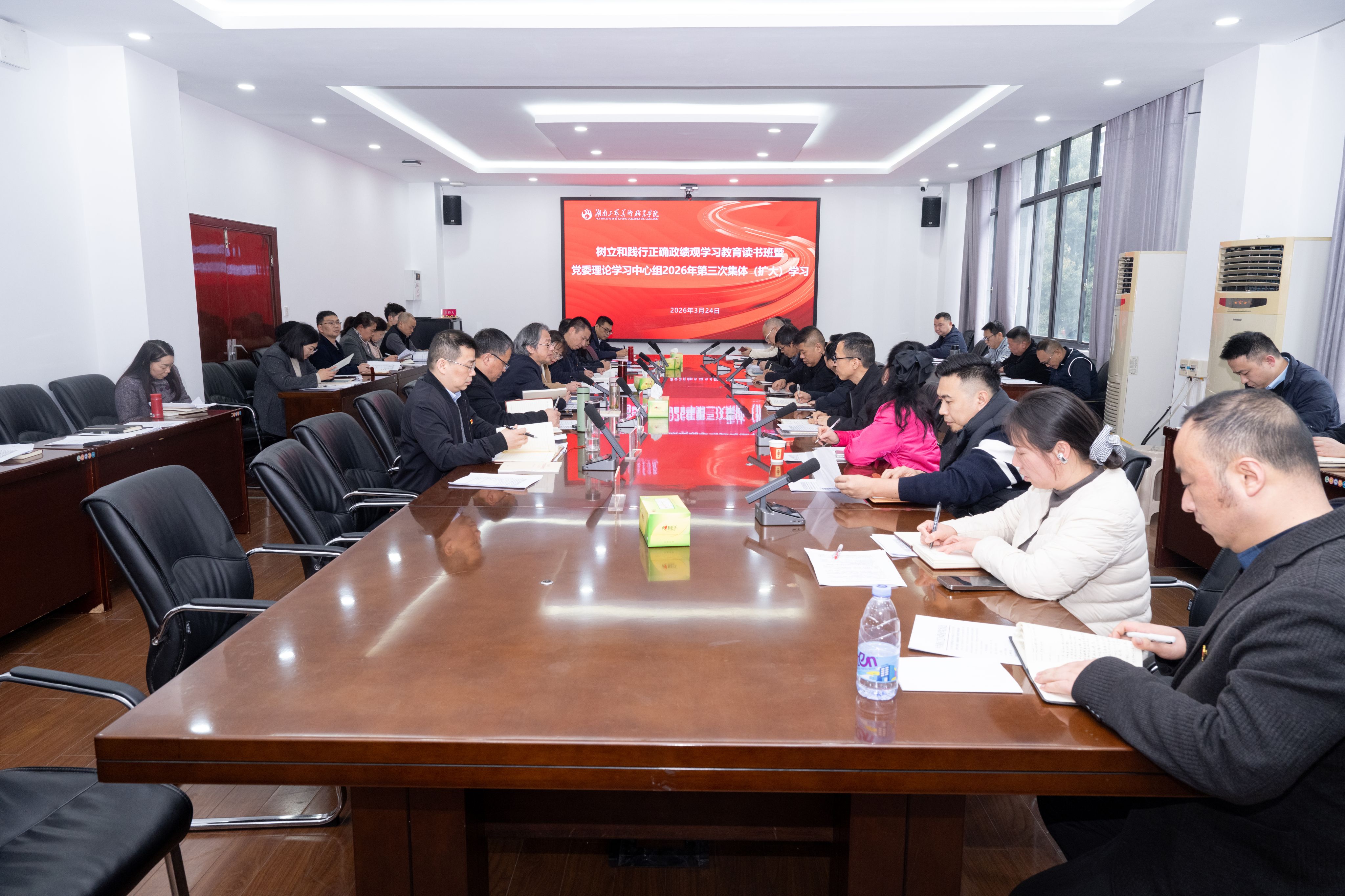 3月24日下午,学校举行树立和践行正确政绩观学习教育读书班暨党委理论学习中心组2026年第三次集体(扩大)学习,深入学习领会习近平总书记关于树立和践行正确政绩观的重要论述。学校党委书记陈鸿俊主持学习并讲话,党委副书记、校长夏能权及党委领导班子成员、全体中层正职等参加读书班。