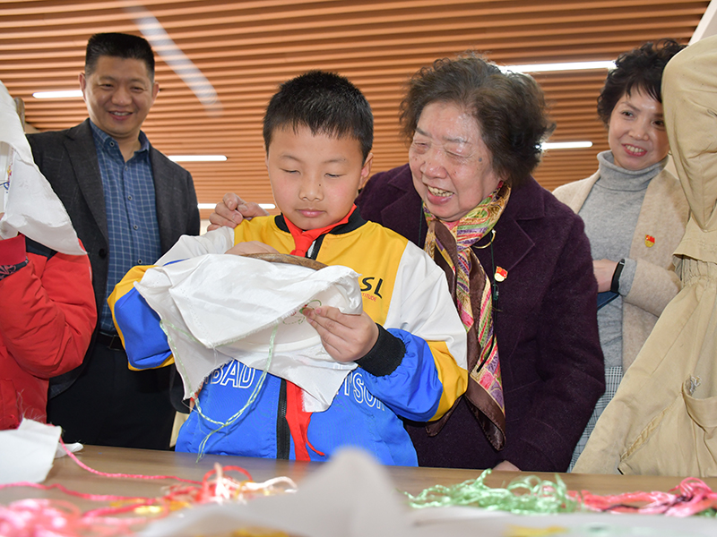 活动体验环节,学院师生与中南小学师生们分享了劈线和刺绣的步骤与方法。令人感动的是,82岁高龄的刘爱云现场还亲自为同学们示范针法的绣制。孩子们跃跃欲试,在老师们的耐心指导下,每人都完成了一副自己喜欢的作品。