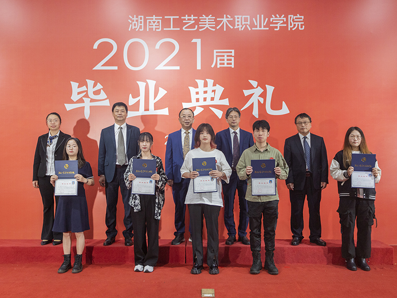 典礼现场,校领导为毕业生代表颁发毕业证书并合影留念。