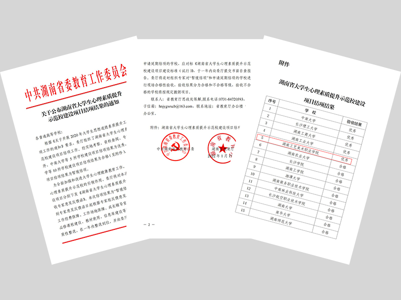 日前,省委教育工委、省教育厅公布湖南省大学生心理素质提升示范校建设项目结项结果,学校2017年立项的湖南省大学生心理素质提升示范校建设项目获评“优秀”。