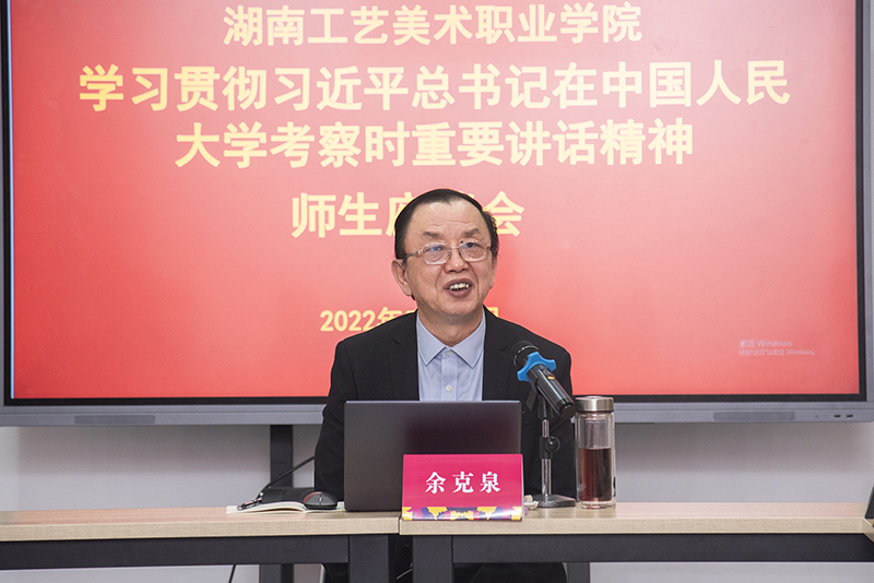 在认真听取大家发言后,余克泉发表了讲话。他强调,要贯彻落实习近平总书记在中国人民大学考察时的重要讲话精神,扎根中国大地办大学。坚持和加强党对学校工作的全面领导,坚持办学正确政治方向,全面贯彻党的教育方针,把思想政治工作贯穿教育教学全过程,努力培养更多德智体美劳全面发展的社会主义建设者和接班人。深入贯彻落实《中国共产党普通高等学校基层组织工作条例》,进一步健全党对学校全面领导的组织体系、制度体系和工作机制,推动党建与学校事业发展深度融合,以高质量党建引领学校高质量发展。