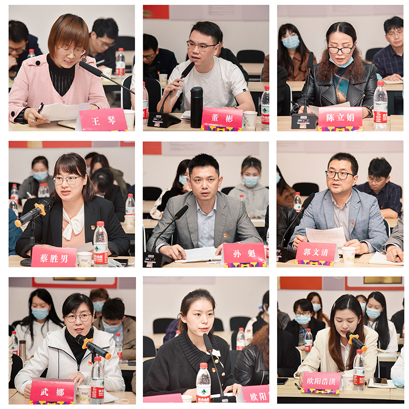 马克思主义学院教师王琴表示,作为思政课教师要在教学内容安排、课程实践和社会实践等环节将习近平总书记对青年学子的要求有机融入思政课教学之中。视觉传播设计学院教师董彬表示要在日常教学中把湖湘本土红色文化、社会主义核心价值观等植入课堂教学,用心、用情、用力做好课程思政工作。服装艺术设计学院教师陈立娟分享了自己近30年来,从学校的一名普通学生成长为人民教师的心路历程,她认为作为一名职业院校的教师不仅是职业技能的高手、是技能“经师”,更是职业素养的样板、是行为“人师”。孙魁、蔡胜男、郭文清、武娜、欧阳慧、欧阳浩洪等教师代表满怀对教育的事业心和责任心纷纷发表自己在工作岗位上的所思所想,总结分享自己在教学和管理中的经验做法,畅谈了以后开展工作的好想法、好愿景。