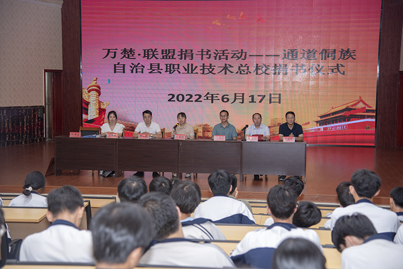 随后,举行了万楚•联盟捐书活动——通道侗族自治县职业技术总校捐书签约仪式,夏能权、瞿水波、吴豆苏分别代表联盟、万楚集团和通道职业技术总校签订图书捐赠协议。夏能权、瞿水波共同为通道职业技术总校“致美图书室”揭牌。