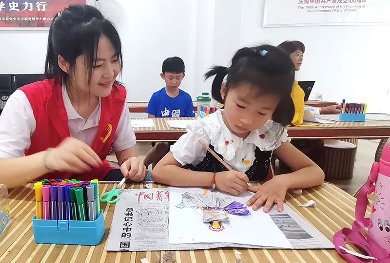 志愿者指导小朋友创作环保创意画