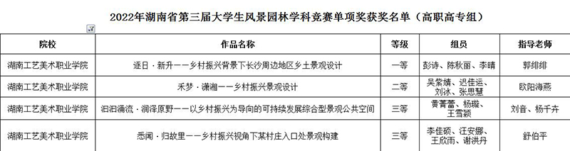 近日,由湖南省教育厅主办的2022年湖南省第三届大学生风景园林学科竞赛获奖名单公布,我校环境艺术设计学院代表队在各高校代表队中脱颖而出,喜获一等奖1项、二等奖1项、三等奖2项,学校荣获优秀组织奖。
