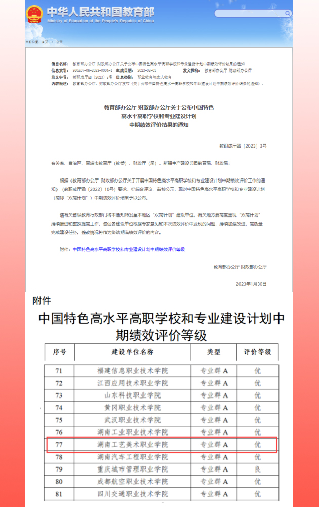 2月14日,教育部办公厅、财政部办公厅发布了《关于公布中国特色高水平高职学校和专业建设计划中期绩效评价结果的通知》,确定了全国197所“双高计划”建设单位的评价等级,其中160所院校获得“优”等级,37所院校获得“良”等级,我校获评“优”等级。“双高计划”中期绩效评价包括“建设单位自评、省级教育行政部门和财政部门组织的省级评价、教育部和财政部组织的两部评价”三个阶段,重点评价建设方案和任务书的落实情况、承担改革发展任务和发挥引领作用的成果成效等方面,评价结果等级划分为“优”“良”“中”“差”四档。