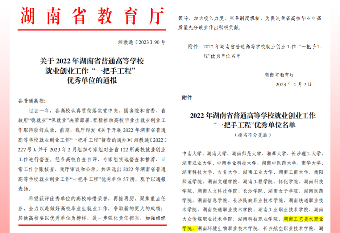 近日,湖南省教育厅《关于2022年湖南省普通高等学校就业创业工作“一把手工程”优秀单位的通报》(湘教通〔2023〕90号)公布了2022年全省高校就业创业“一把手工程”优秀单位,我校获评2022年湖南省普通高等学校就业创业工作“一把手工程”优秀单位,这是学校第六次获评就业创业工作“一把手工程”优秀单位。
