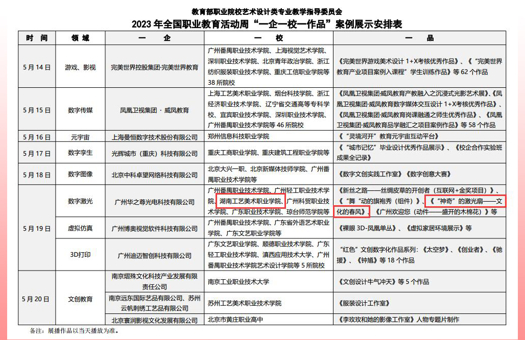 近日,2023年职业教育活动周全国启动仪式暨全国职业院校技能大赛开幕式在潍坊市鲁台会展中心举行。学校手工艺术学院学生作品《“神奇”的激光扇——文化的春风》入围2023年职业教育活动周“一企一校一作品”案例展示。
