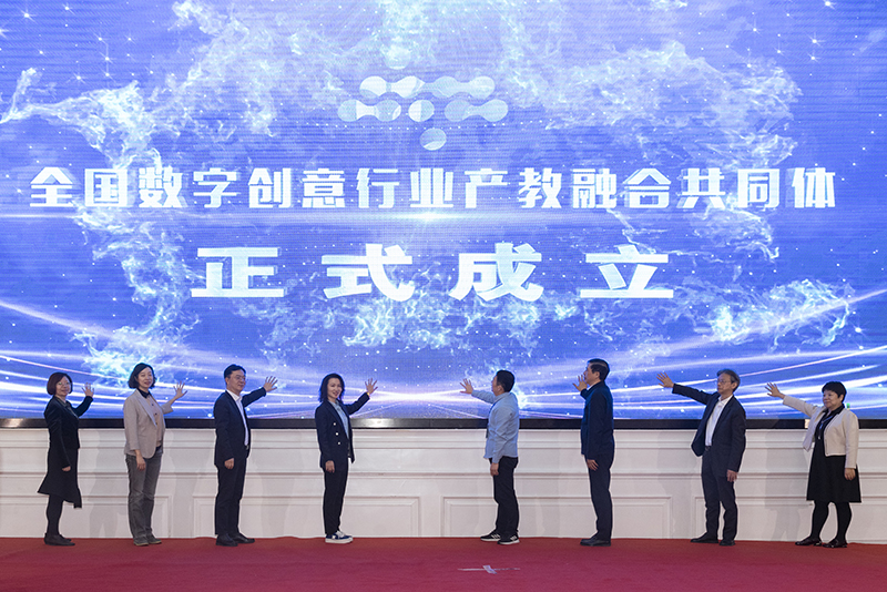 崔书芳、张来源、王雨蕴、王清平、陈京炜、陈鸿俊、葉子、蒋艳共同按下启动仪,全国数字创意行业产教融合共同体正式成立。
