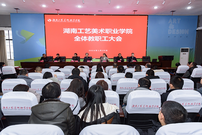 1月25日上午,湖南工艺美院在致美楼五楼学术报告厅召开全体教职工大会,全面总结2023年度工作,表彰2023年度先进集体和个人。党委书记陈鸿俊、校长夏能权及全体校领导出席大会,党委副书记汪泳波主持会议,全体教职工参加。长沙基地与会人员参加视频会议。